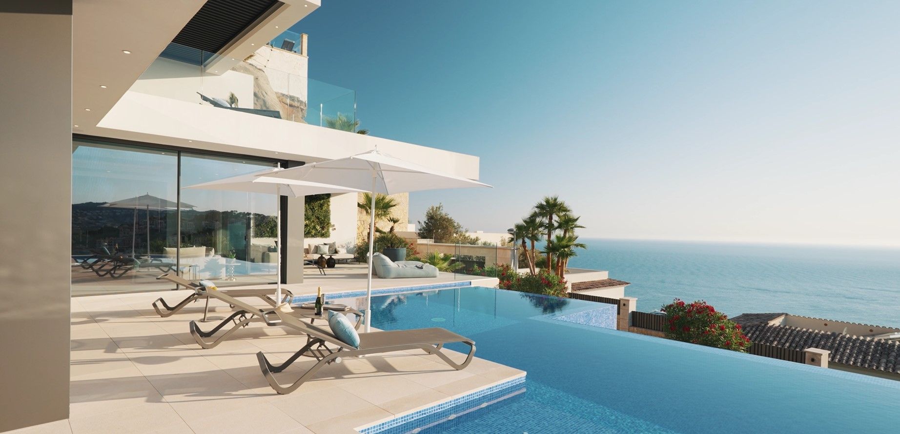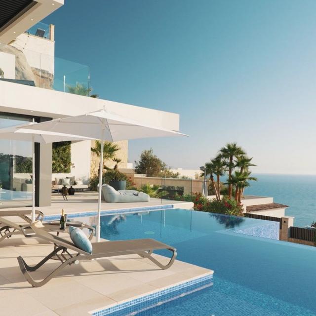 Marimont wurde mit viel Liebe zum Detail entworfen, um den atemberaubenden Panoramablick von den wichtigsten Räumen und Terrassen aus optimal zu gestalten. Mit ihrer Ausrichtung nach Südwesten hat die Villa den ganzen Tag über Sonne und man genießt die unglaublichsten Sonnenuntergänge bei denen man die Silhouette der Nachbarinsel Ibiza sehen kann. Durch die sorgfältig gewählte Gebäudeausrichtung, Höhenlage, Layout und Einbindung in die Landschaft konnte das perfekte Umfeld geschaffen werden, in dem man das Mittelmeer und gleichzeitig absolute Privatsphäre genießen kann.
