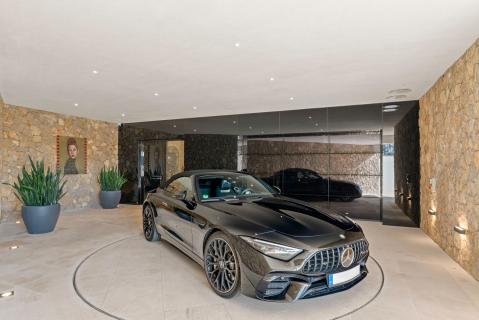 In der eindrucksvollen Bauweise sind freitragende Strukturen mit frischem, weißem Verputz und einer perfekt ausgearbeiteten minimalistischen Glasfassade kombiniert. Das Gebäude ist anhand einer klassischen Kombination aus Kalkstein und wunderschön verarbeiteten mallorquinischen Natursteinmauern nahtlos in die Natur eingefügt.